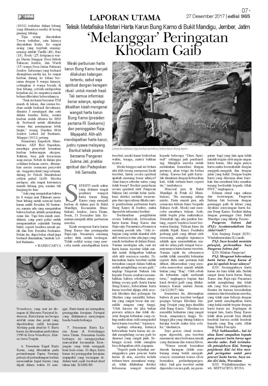 Meski perburuan harta karun Bung Karno banyak dilakukan kalangan tertentu, sebut saja spiritual dengan beragam ritual untuk meraih hasil. Tak semua informasi benar adanya, apalagi dikaitkan kisah mengenai wangsit harta karun Bung Karno (Presiden pertama RI Soekarno) dan peninggalan Raja Majapahit. Alih-alih mendapatkan harta karun, justru nyawa melayang. Berikut telisik Posmo bersama Pangeran Sukma Jati (Ki Sukma Jati), praktisi spiritual dari Padepokan Inti Semesta.